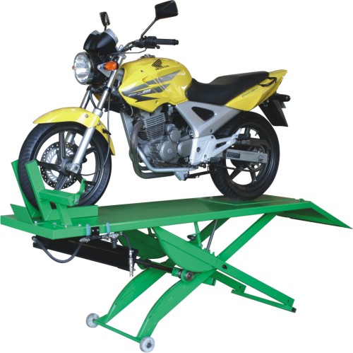 Equipamento com sistema de elevação pneumática para motocicletas, com capacidade até 400 kg. Dotado de cilindro pneumático, trava de segurança, plataforma traseira e rampa de acesso móvel.
